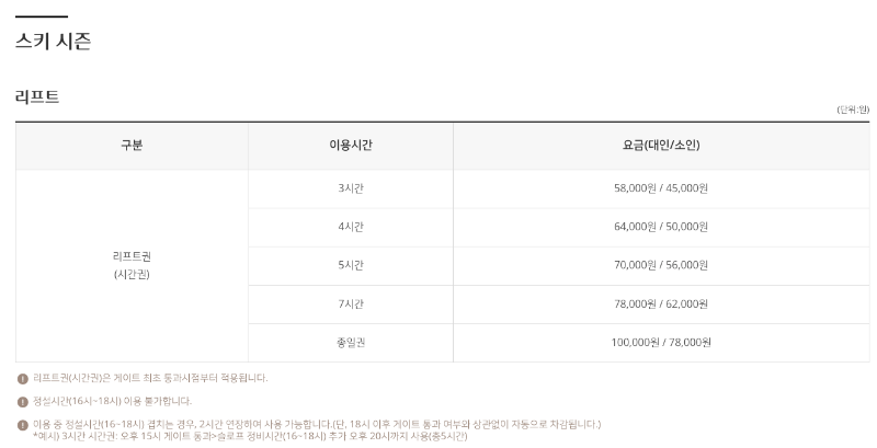 리프트권 가격: 데이패스(Day pass) 존재, 24/25 시즌 가격 미정