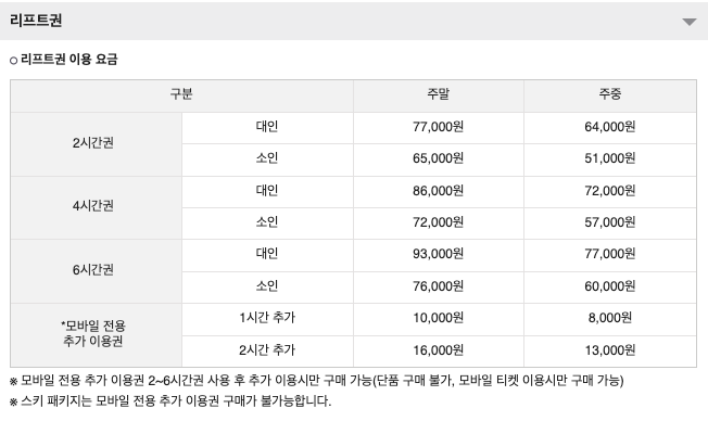 • 리프트권 가격: 약 7만원 (5시간권, 주말 기준)
