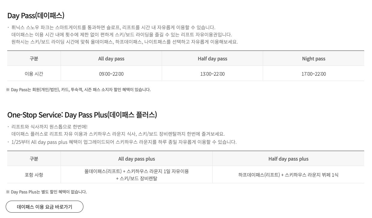특히 휘닉스 파크에는 Day Pass(데이패스) 시스템이 있어, 스마트게이트를 통과하면 슬로프, 리프트를 시간 내 자유롭게 이용할 수 있습니다. 쉽게 생각하시면 자유이용권 같은건데요. 올데이패스, 하프데이패스, 나이트패스 3가지가 있어 취사 선택하여 이용이 가능합니다.