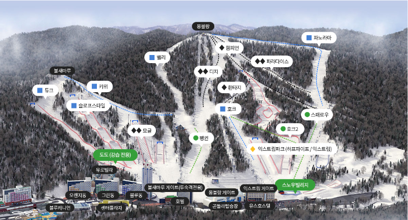 슬로프 개수: 18개 (초급 4개, 중급 6개, 상급 2개, 최상급 3개, 파크 3종)
