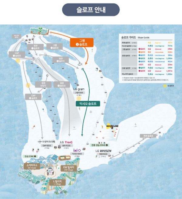 • 오픈 슬로프: 임시 슬로프(우하단) & 그린 슬로프(초급자 코스)